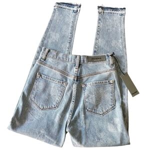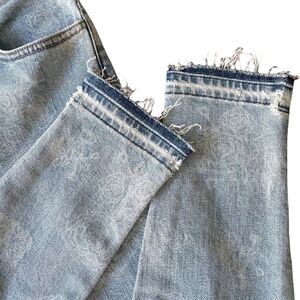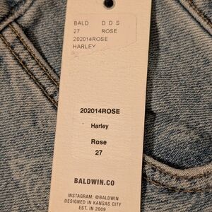 Baldwin Jean Co Harley style in size 27. Light wash denim with rose print detail and exposed front zip. Raw hem finish. New with tags attached.