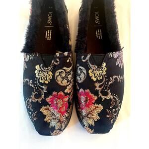 Slip into comfort and elegance with these TOMS flats, featuring black floral brocade faux fur lining trim. The pattern includes metallic gold, silver, and pink/red threading.
