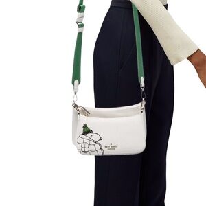 The Kate Spade x Peanuts Snoopy Double Up White Leather Crossbody Bag is a stylish and versatile accessory perfect for any woman. This small-sized bag features a white leather exterior with pebbled finish and gold hardware accents. The bag showcases a fun applique of Snoopy, adding a touch of novelty to the design. The green nylon and white leather crossbody strap is adjustable, making it convenient for everyday use. With inner pockets, a lined interior, and a convertible style, this limited edition bag is both practical and fashionable, making it a great gift for any Peanuts fan.