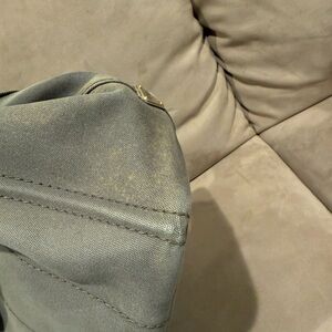 Beautiful olive green tote with side snap closures and features interior zip and slip pockets for storage. Small feet on the bottom help protect the bag. This bag can be worn two way. Comes with adjustable strap. Light corner wear and slight fading on handles. Overall great condition.