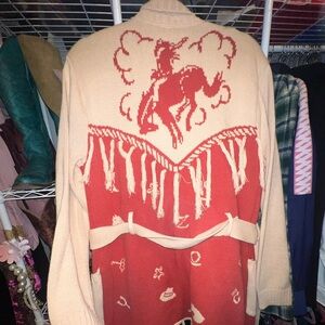 Chic Idyllwind cardigan in cream and red. Beautiful brick red color. Thick and warm, perfect over a dress or jeans! Features a cozy design with fringe details. Fringe in the bottom and top of the cardigan. Mid length cardigan! Ideal for layering. Amazing condition!