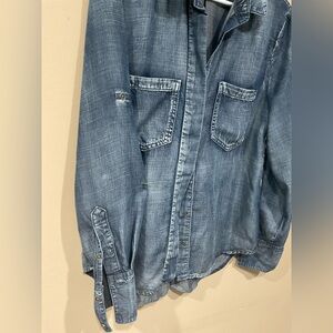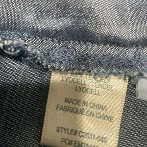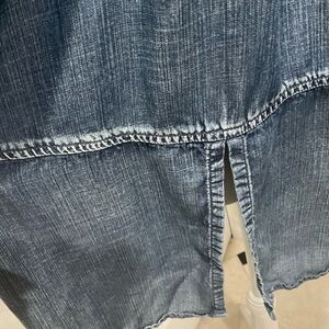 Nicely designed, thin 100% tencel, roll up sleeves on button, chest pockets, elongated back with high slit, rounded sides, 26/29” long, shoulders 16.5”, 25” long cuffed roll up sleeves, like new condition