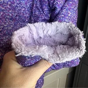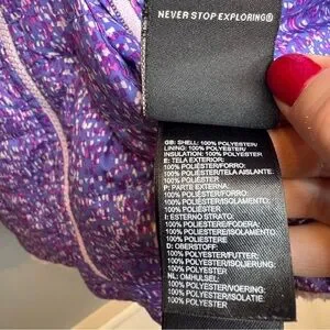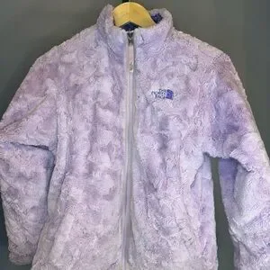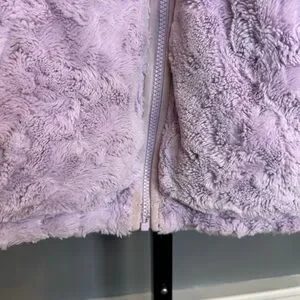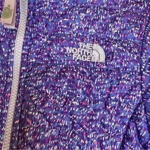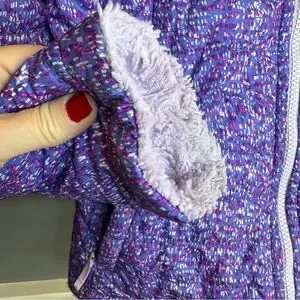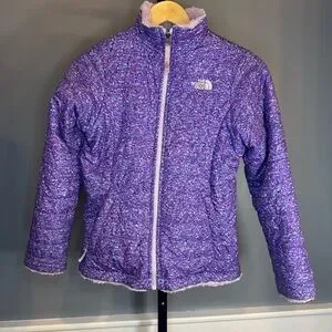 The North Face girls reversible jacket featuring a purple patterned quilted puffer on one side and ultra-soft lavender fleece on the other. Lightweight yet warm with full zip closure—perfect for school, outdoor play, and cold weather layering.