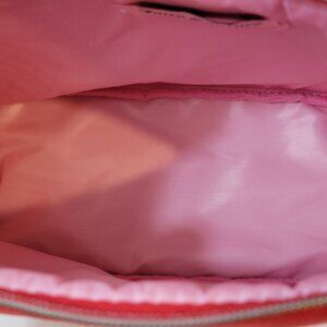 Condition is excellent. There is light creasing and small fabric bubbles visible on the back and bottom, which are consistent with velour construction and manufacturing rather than wear. No stains, no tears, and the zipper works smoothly. Interior is clean with pink satin lining.
