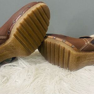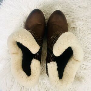 In perfect condition except for two tiny scuffs (refer to pics) brown leather with Sherpa fold over and fleece lining. Stud detail , side belt buckle , block heel. Side inside zip closure size 38 or 7.5 US. Made in Italy
