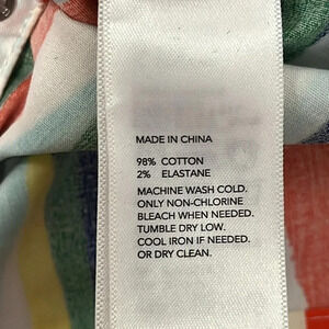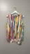 Excellent condition. Rare. Vibrant coloured vertical striped pattern. Full metal snap sides. Keyhole snap closure back. Straight hem, slightly longer in back.