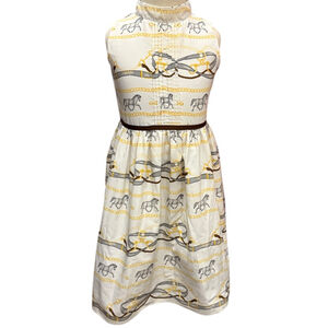 Classic and charming Janie and Jack sleeveless dress featuring an elegant equestrian print with horses, chains, and bridle details in ivory, gold, and gray. Designed with a high neckline, button-back closure, and a softly gathered skirt with a slim brown belt at the waist. Perfect for special occasions, family photos, holidays, or everyday polished style.