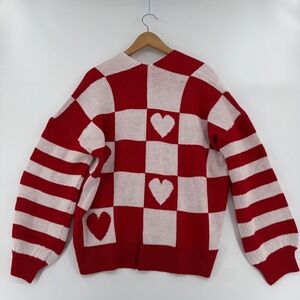 BIBI Red White Heart Checkered Valentine Oversized Cardigan Sweater Medium NWT