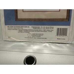 This kit includes the printed design on polyester fabric, Cotton Floss, Needle, Directions and Stitch Instructions, needed to create a beautiful hand-stitched cross stitch sampler with a white color scheme, perfect for adding a touch of whimsy to any space. Made in the United States by JCA, this kit is sure to bring joy to crafters, collectors and fans of the Peter Rabbit stories. Does not include a frame.