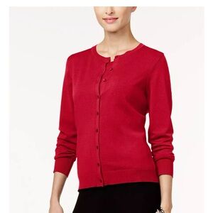 August Silk teal blue long sleeve button front cardigan sweater. Crew neckline with a classic button closure down the front. Ribbed cuffs and hem. Versatile layering piece.