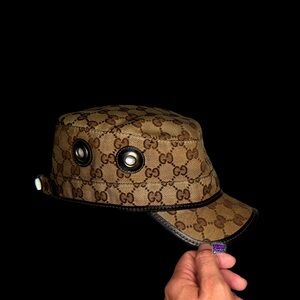 An early-2000s Gucci by Tom Ford GG monogram canvas military cap, cut with a rigid crown and extended brim, finished with metal grommet detailing and leather trim. The structure alone separates this from contemporary reproductions. This piece sits closer to runway utility than streetwear, designed to frame the face with authority rather than decoration.