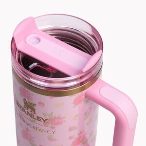 Stanley x LoveShackFancy Ibiza Sunset 30 oz. tumbler with pink floral design. This tumbler is 💖gorgeous💖it has the prettiest pink + gold design with almost watercolor like rose florals and it is covered in ✨shimmering glitter!!✨Even the straw + lid is covered in gold glitter! The straw also features a bow straw topper🎀 You can also take out the straw + flip the top of the lid to drink from a hidden opening if you prefer :) Or you can take out the removable tab from the lid completely! And of course you can place the tab completely shut for on the go trips.