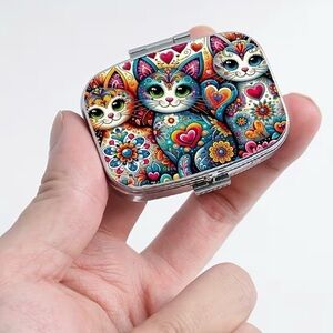 Folk Art Cat Animal Inspired Pill Organizer 2-Compartment Compact Pill Case New