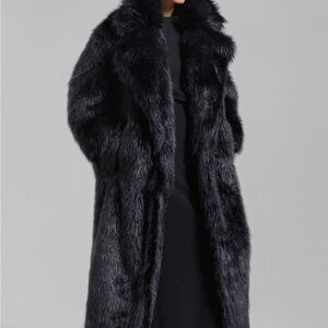 Elegant coat with luxurious faux fur collar. Sleek black design. Ideal for chic outings. Long length. This coat is sized M/L. NWT