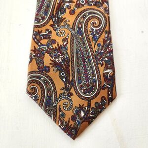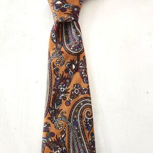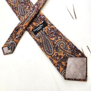 This vintage Christian Dior Monsieur silk necktie showcases a vibrant paisley pattern in shades of orange, blue, and red. This meticulously crafted tie offers a distinguished addition to any formal or business attire. It measures 57" x 4".