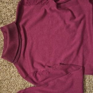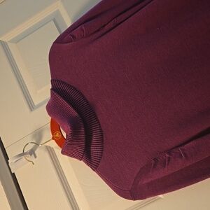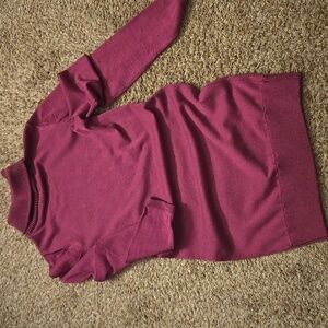 This elegant sweater dress has a turtle neck. The hem and cuffs are banded. The length from the shoulder to the hem is 34". Size large. It is premium knit for a warm and comfy feel. The color is between a pink and a lavender.