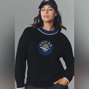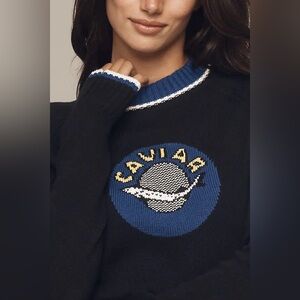 This fitted sweater by Rachel Antonoff features a high neck, raglan sleeves, striped trim, and a caviar intarsia motif. It is a pullover style.