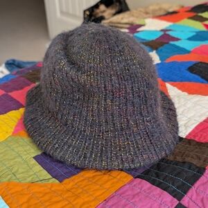 Stylish knit bucket hat in a dark gray color with subtle multicolor specks. Perfect for adding a cozy and fun touch to any outfit.