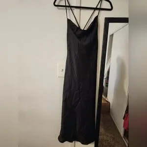 NWOT This stunning black gown by Show Me Your MuMu features a sleeveless design with delicate spaghetti straps, perfect for a wedding guest or cocktail event. The dress boasts a graceful, flowing silhouette that drapes elegantly to the floor, while the backless design adds a touch of allure. Crafted from a lightweight fabric, it ensures comfort and ease of movement.