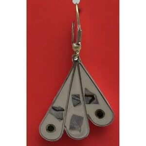 These vintage earrings from Mexico are a beautiful addition to any collection. The silver Alpaca material is adorned with inlay Onyx and Abalone enamel in a fan-shaped design. The dangle/drop style is perfect for any bohemian-themed outfit and the hook closure ensures they stay securely on the earlobe.