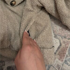 Stay stylish and warm with this cozy cream teddy jacket. Perfect for layering on chilly days. Oversized, can fit medium comfortably. The pockets up front are very roomy. Also has side pockets