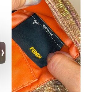 Fabric remains vibrant and luminous with no major flaws. Front logo hardware shows light wear and fine hairline scratching consistent with gentle use. Chain and structure are intact and present beautifully. Description: Rare and highly collectible Fendi pochette crafted in a stunning iridescent metallic fabric that shifts effortlessly between gold and soft pink tones, creating a luminous, color-changing effect depending on the light. Finished with Fendi’s iconic oversized FF logo hardware at the front, this piece is a true statement accessory and a standout example of Fendi’s bold, fashion-forward design era. The sleek pochette silhouette offers versatile styling options — wear it as a shoulder bag, carry it as a clutch, or swap the chain for a longer strap to wear it crossbody. The compact shape is perfect for essentials while still delivering maximum impact. This is a rare find and a true collector’s piece, ideal for evening wear, special occasions, or elevating a minimalist outfit with a pop of iridescent glamour. Bag Details & Attributes (approximate): Width: ~8.5 in (21.5 cm) Height: ~4.5 in (11.5 cm) Depth: ~2 in (5 cm) Strap: Removable chain strap Closure: Top flap with magnetic snap Hardware: Gold-tone FF logo hardware Material: Iridescent metallic fabric Interior: Compact, perfect for essentials