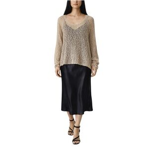 The knit is intentionally airy and textured, allowing light and layering to show through. A true wardrobe transformer.