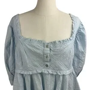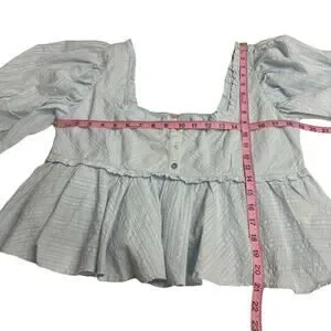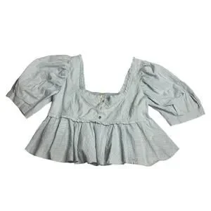 Women's Free People Leave It To Me Cool Air Light Blue Blouse Puff Sleeve Peplum Babydoll Cropped Top sz Large