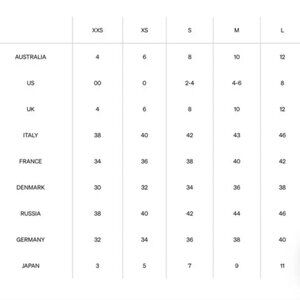 XXS/US0/AU4, XS/US2/AU6, S/US4/AU8