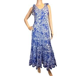 Free People Kikas Blue White Floral Tie Shoulder Maxi Tiered BOHO Dress Medium