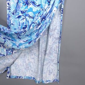 The Lilly Pulitzer Essie Maxi Dress in size M is a tropical turquoise floral dress with an elephant pattern, perfect for various occasions such as travel, parties, or casual outings. This sleeveless dress features a V-neckline and button closure, made from a blend of cotton and modal jersey fabric. The dress has a fit & flare style with a side slit, making it lightweight and stretchy for comfort. With its colorful tropical theme, this dress is ideal for the summer, fall, and spring seasons, adding a touch of beachy flair to your wardrobe.