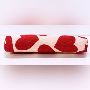 A charming bag with bold red heart design from Miu Miu beauty line. Kiss lock closure, removable chain. New in box. Approximate measurements 8.5”L x 4”T x 2” D.