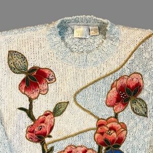 Needles & Yarn Sweater Pullover Applique Flowers Gold Trim Medium Vintage 80s