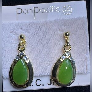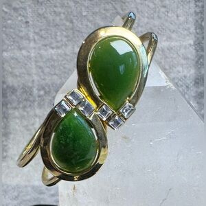 Authentic Jade Set of Gold Tone Earrings, Necklace & Bracelet with Rhinestone accents, made in British Columbia. Very good condition