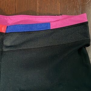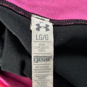 Good condition - Women's Under Armour Fitted All Season Gear Workout Leggings. Has a pocket in the waistband. Measures 37” from top to bottom. Colors: black, pink, blue, and green. Size: L.