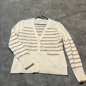 Elegant cardigan with cream and tan stripes. Features button front and pockets. Ideal for layering.