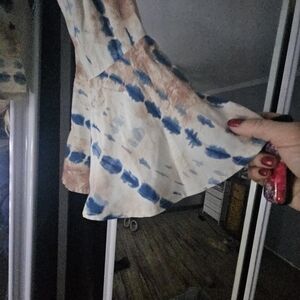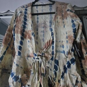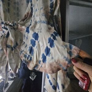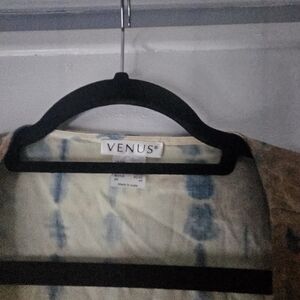 NWT Stylish VENUS crop top with a vibrant tie-dye design. Features a mix of blue and tan hues. Perfect for casual wear.Ties is front!