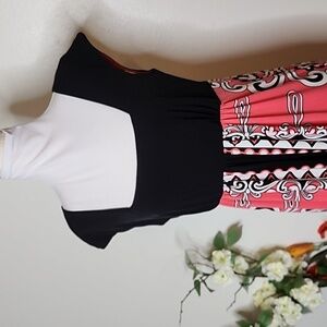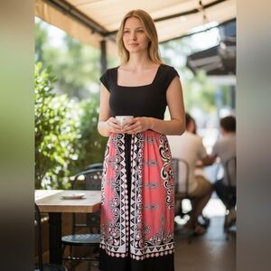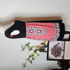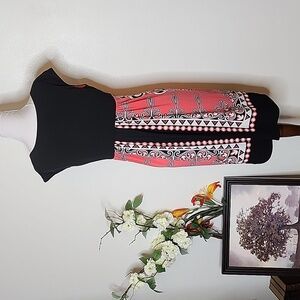 London Times Coral Scroll Abstract Pattern Dress Black Sheath Summer Bohemian