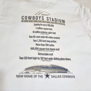 NFL Dallas Cowboys 2009 Inaugural Season Stadium T-Shirt, white and gray, size medium. Limited edition Cowboys Stadium Inaugural Season Reebok tee shirt with stadium statistics.