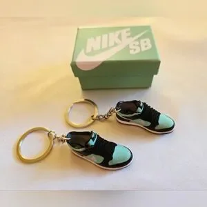Add a sporty touch to your keys with the Nike SB sneaker keychain set. Featuring a sleek black and mint design, these keychains are a must-have for sneaker fans.
