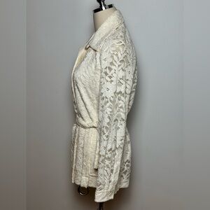 • Tailored lace jacket with notched collar, long sleeves, and a matching waist tie for a flattering silhouette