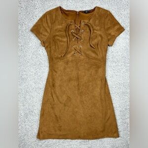 Express Dress - Lace Up Neck - Faux Suede - Camel - Mini - Zip Up Back - Western - Rodeo - Country - Party -