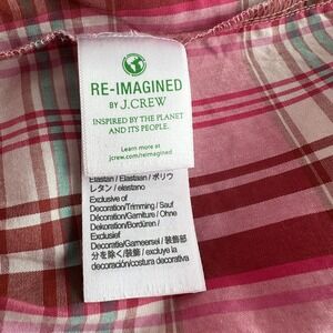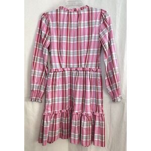 J. Crew pink plaid casual dress with ruffle details. This dress features a V-neckline with a ruffled collar and a button-up placket. Long sleeves have elasticized cuffs for a comfortable fit. The bodice is defined by a ruffled elasticized waistband, leading to a tiered skirt with ruffle accents. Side pockets are included for added convenience.
