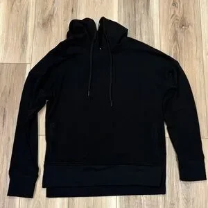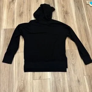 Sleek black hoodie with drawstring. Comfortable and versatile. Ideal for casual wear. Some loose threads as shown in pictures. Only worn a handful of times.