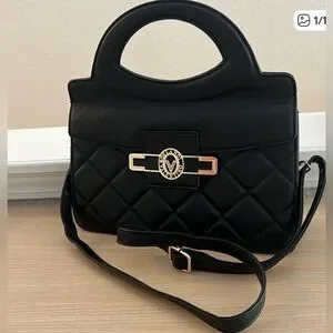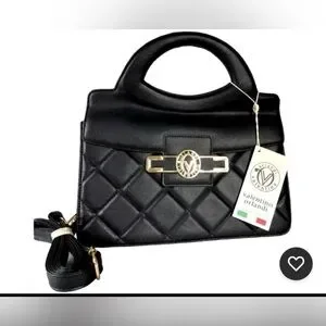 This is a Valentino Orlandi black quilted vegan leather top handle bag with a "V" lock and a removable crossbody strap. A9