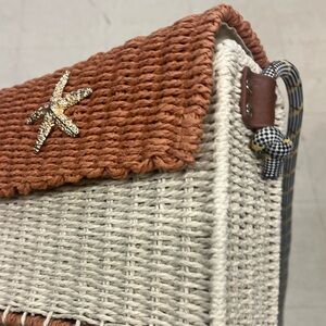 Sun N Sand box shaped crossbody purse is perfect for a day out in a sunny destination. Two-Tone weaved straw with gold metal starfish on front will make heads turn.