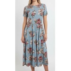 Romantic floral midi dress from Pierre Cardin, featuring a charming bloomcore aesthetic perfect for a garden party or cottagecore style. The dress showcases a delicate floral pattern, a pleated waistline that enhances the flattering silhouette, and side seam pockets for added convenience. Details include short sleeves, a round neckline, and three fabric-covered buttons at the back of the neckline.