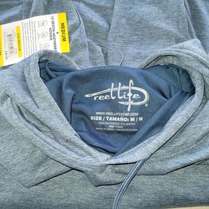 Reel Life Men's Long Sleeve with Hoodie, gray color Size M. The sleeves are 25 inches long. This gray shirt is perfect for casual outings, fishing, beach, or relaxing at home. Enjoy the soft fabric and classic design.