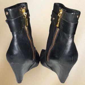 RACHEL Rachel Roy Black Leather Wedge Heel Boot Gold Accents Buckles Size 7