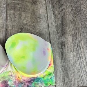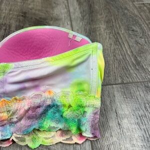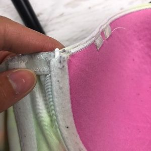 Has been worn. one of the wires has poked through the material which is shown in the photo. Strapless style bra and does not comes with the straps. Lace section under the cups. No additional padding. Multicolored Marble like pattern